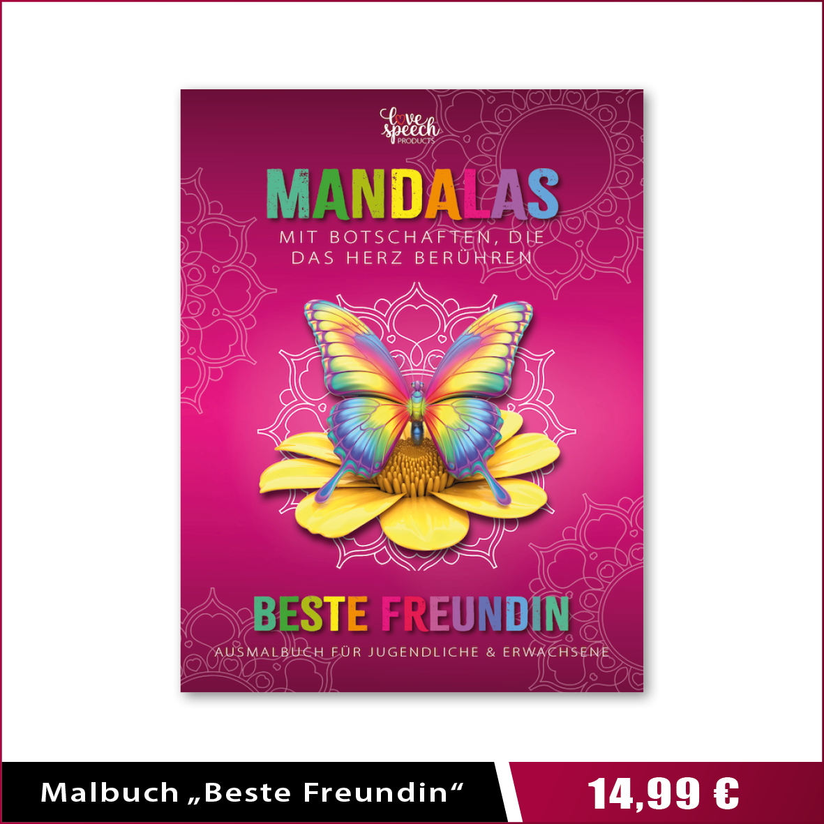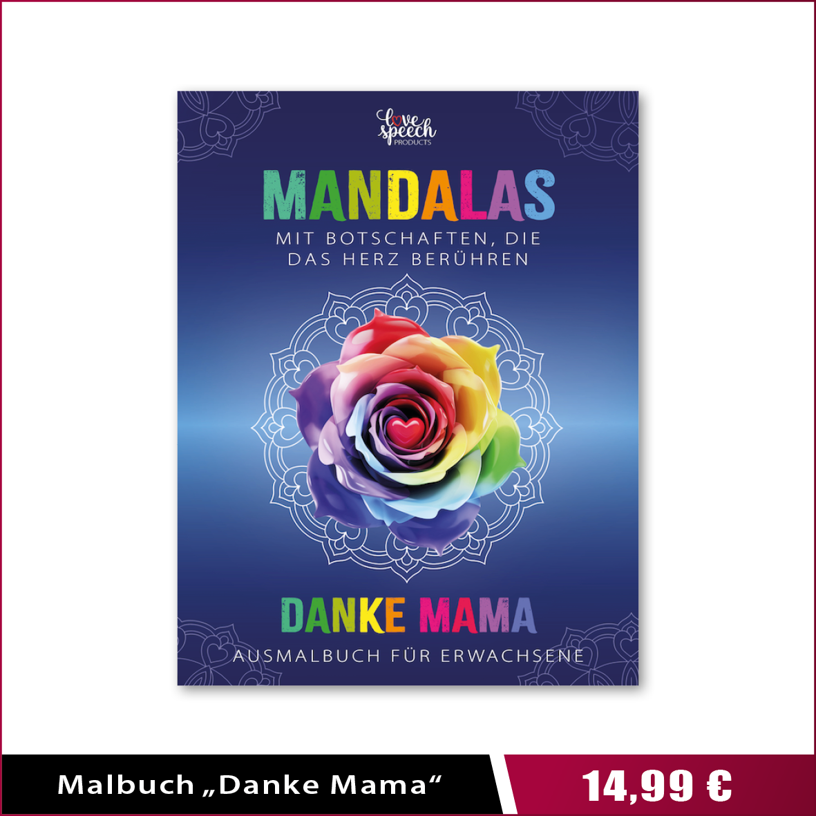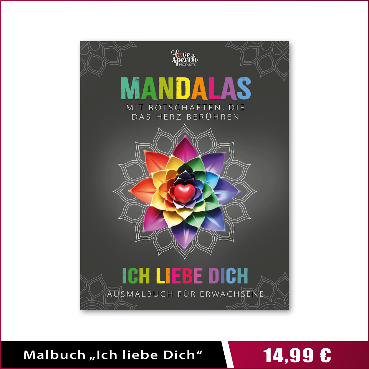 Ganz besonders stolz bin ich auf meine LoveSpeech-Produkte. Das Adventskalender- & Weihnachts-Gutscheinbuch Quality-Time für Paare und die Reihe der Mandala-Ausmalbücher. Sie sind nicht nur einfache Malbücher, sondern ganz besondere Geschenke, die Dir und Deinen Liebsten das Gefühl von Wertschätzung, Liebe und Verbundenheit schenken durch zusätzlich je 50 liebevolle Botschaften. Direkt auf AmazonPrime bestellbar.